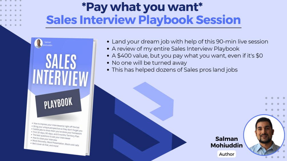 Land your dream job. In this 90-min live session I will review my entire Sales Interview Playbook. Guaranteed to knock the socks off your interviewer.
