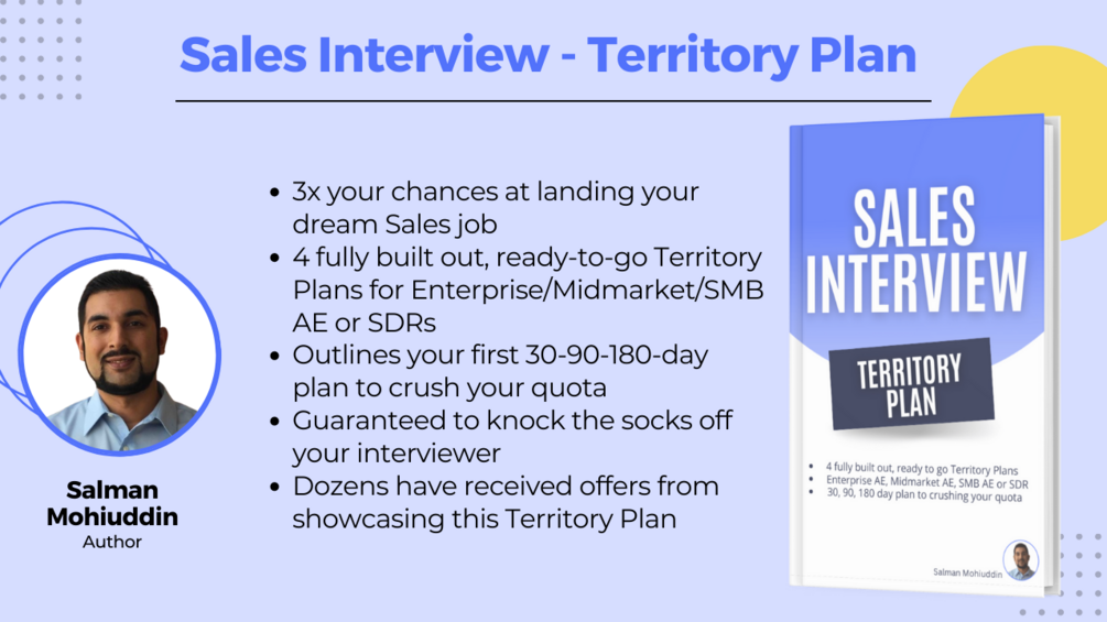 Want to boost your chances 3x to land your dream Sales job? These are 4 fully built out, ready to go Territory Plans for your Enterprise AE, Midmarket AE, SMB AE or SDR Sales Interview. It outlines your 30-day, 90-day and 6 month plan to crushing your quota. Knock the socks off of your interviewer and land that job. Dozens have received offers from showcasing this Territory Plan. Go get it and rock your interview!